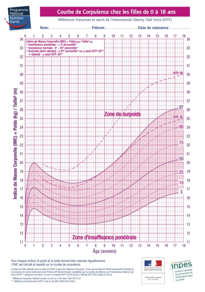 Pour les enfants et jusqu’à l’âge de 18 ans, la valeur de l’IMC doit être reportée sur les courbes de corpulence de référence présentes dans le carnet de santé. En effet, la croissance pondérale de l’enfant évolue en 3 phases :